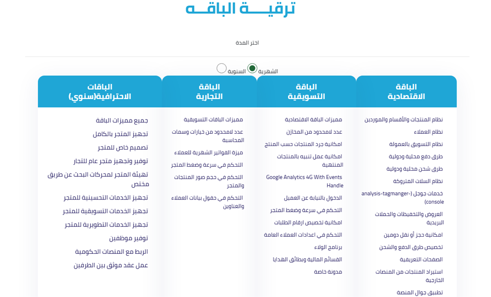 قم باختيار المدة التي تريد والباقة المطلوبة ان كنت تريد الترقية من الشهري الى السنوي او من الباقة الحالية الى الباقة الاعلى فقط قم باختيار الباقة المرغوبة بعدها قم بالضغط على زر التوجه للدفع الموجود في الاسفل