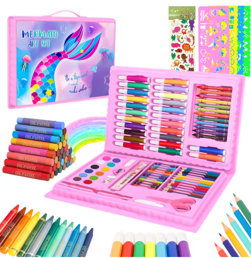 مجموعة فنية للرسم مكونة من 100+: لوازم حرفية حورية البحر مع علامات قابلة للغسل - مجموعة فنية غير سامة لهدايا الأطفال الصغار من عمر 3 إلى 12 عامًا