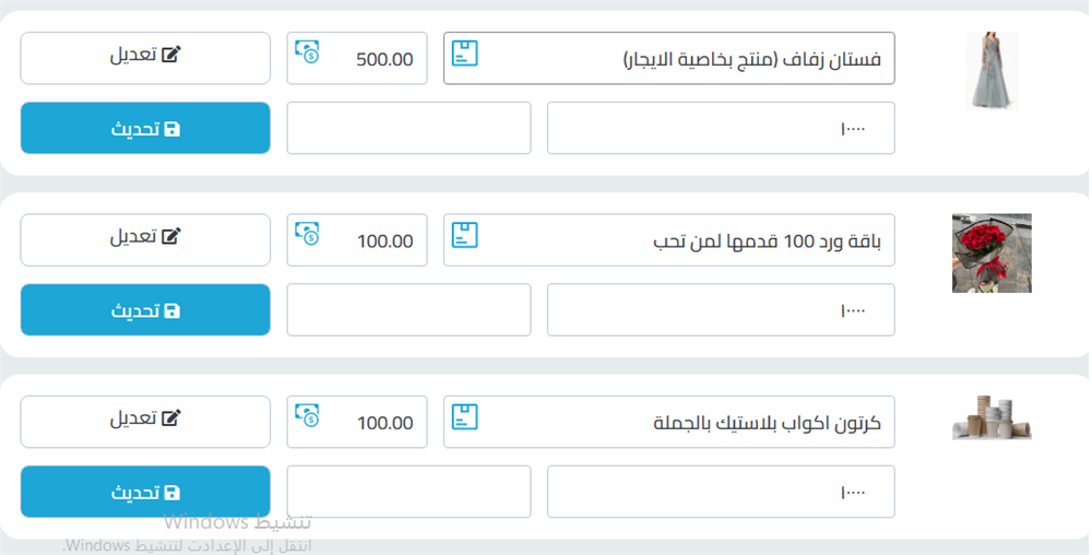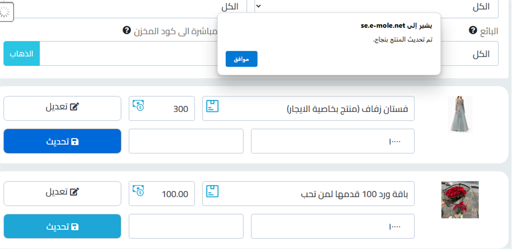 فملا لو أردنا تعديل سعر فستان زفاف فقط نقوم بتعديل السعر في نفس المربع من 500 الى 300 ثم نقم بالضغط على زر تحديث لتحديث سعر المنتج بعدها ستظهر لنا رسالة تفيد بالتحديث كما في الصورة