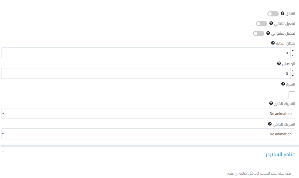 وخيار التفعيل التلقائي لجعل السلايدر يقوم بالتحرك حسب الحركة المعطى له وهو الافضل حتى يجذب انتباه العميل وعند اختياره تظهر عدة اختيارات متفرعة كما في الصورة