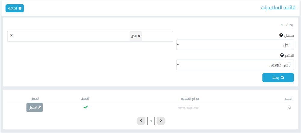1-تبويب بحث للبحث عن السلايدرات حسب التفعيل ان كان السلايدر مفعل ام لا وخيار المتجر إن كان لديك اكثرم من متجر وخيار موقع السلايدر