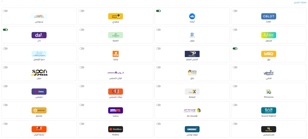 كما يمكن كما هو ظاهر في الصورة تعطيل أي شركة شحن عن العميل إن رأى التاجر ان الشركة غير مناسبة او اسعارها مرتفة او يوجد مشاكل عليها