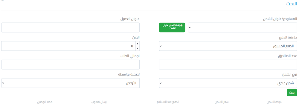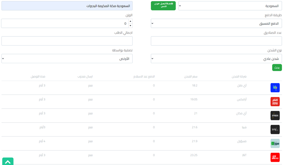 من تبويب بحث يمكن للتاجر في اي وقت الاستعلام عن اسعار شركات الشحن حسب عنوان العميل والوزن واجمالي الطلب وغيره فقط يقوم بتعبئة البيانات وثم الضغط على بحث وسيقوم النظام بعرض جميع شركات الشحن حسب البحث في لوحة التحكم ويمكن للتاجر تحديد نوع الشحن اما شحن عادي او مبرد او طريقة الدفع اما دفع مسبق او عند الاستلام كما يمكنه فرز الشركات حسب الاسرع او الاقل سعرا .