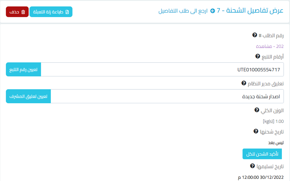 يتم الضغط على حذف الموجود في اعلى يسار الصفحة وبعدها ان تم الغاء الشحنة يقوم بالتوجه لصفحة الطلب والضغط على تعديل واضافة شركة الشحن الجديد وبعدها تتحدث جميع المعلومات والمدفوعات حسب شركة الشحن الجديدة