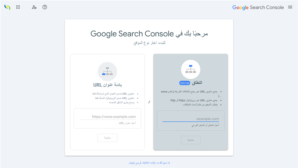 أولا ندخل على موقع جوجل سيرش كونسل على الرابط https://search.google.com/ لاثبات الملكية كما في الصورة