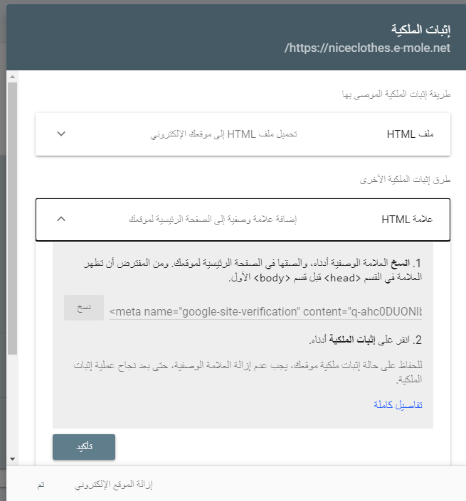 بعد ذلك فقط نقوم بالضغط على زر حفظ بعدها ننتقل إلى جوجل ونقوم بالضغط على زر تأكيد لتأكيد اثبات الملكية كما في الصورة