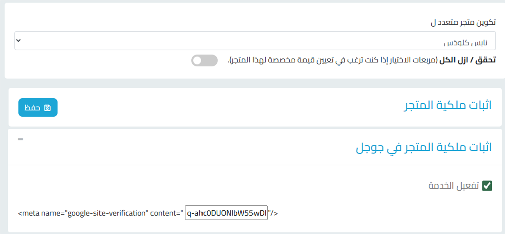 نحن هنا مانحتاج إلى الكود كامل فقط نحتاج للشفرة التي داخل الخاصية content بعدها نقوم فتح تبويب جديد ونفتح لوحة التحكم الخاصة بالمتجر ثم نتوجه لتهيئة المتجر ثم اعدادات المتجر وفي اخر القائمة سنجد خدمة اثبات ملكية المتجر نقوم بالضغط عليها فتظهر الشاشة التالية كما في الصورة